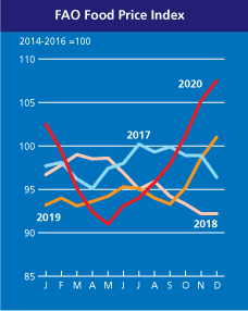 » The FAO Vegetable Oil Price Index averaged 164.7 points in December, up 14.1 points (9.4 percent) from November and reaching a 25-month high. The latest upturn was primarily driven by firming palm oil prices, while soy, sunflower and rapeseed oil values also increased. International palm oil prices rose for the fifth consecutive month on solid demand, especially from the biodiesel sector, coinciding with prospects of tightening supplies. Further to the positive effect from rising palm oil values, the prices of soy, sunflower and rapeseed oils also responded to, respectively, reduced crushing volumes in major producing countries, firm global import demand, and concerns over tightening world supplies. Notwithstanding the strong rebound in prices since November, for 2019 as a whole, FAO’s Vegetable Oil Price Index averaged 135.2 points, down 8.9 points from 2018 and marking the lowest annual average since 2006.