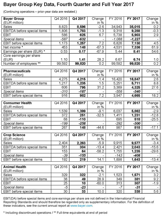 The following tables contain the key data for the Bayer Group and its segments for the full year and the fourth quarter of 2017.