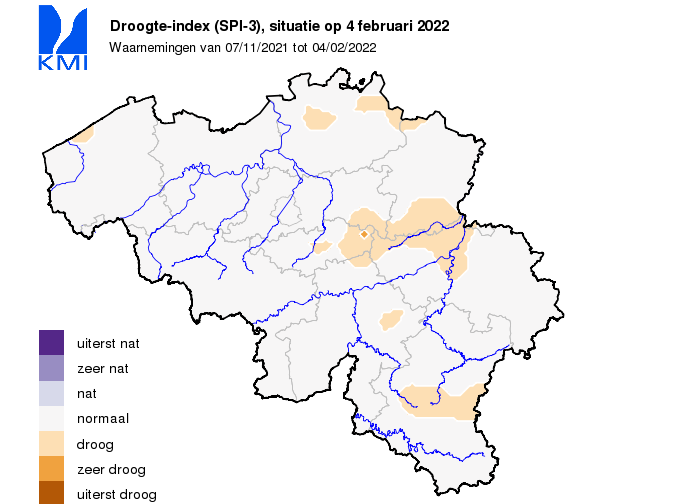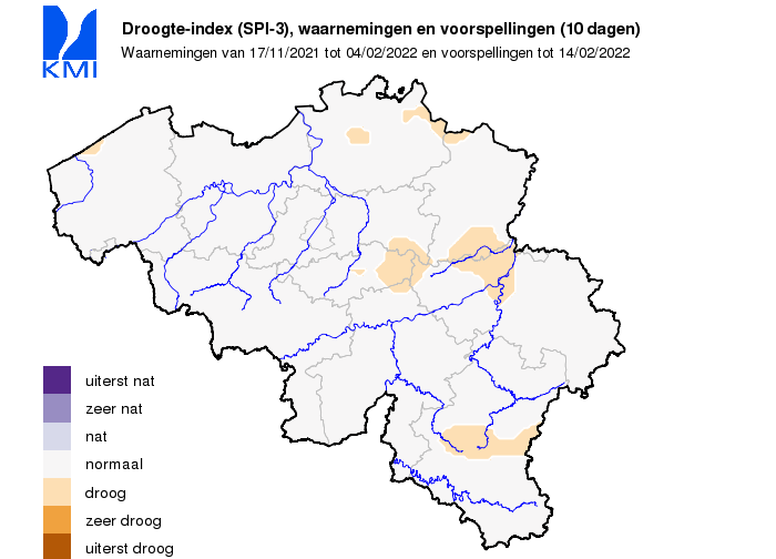 Op de kaartjes hieronder wordt getoond hoe de huidige en de voorspelde droogte-index zich ruimtelijk manifesteert. Er wordt gebruik gemaakt van een genormaliseerde index van de gecumuleerde neerslag van de afgelopen 90 dagen (SPI-3). De gebruikte klassen "nat / droog", "zeer droog / zeer nat" en "extreem nat / extreem droog" zijn opgesteld in verhouding tot een klimatologische referentieperiode van 1991 tot 2020 en komen respectievelijk overeen met terugkeerperiodes van 10 tot 30 jaar, 30 tot 50 jaar en meer dan 50 jaar. Voor de voorspelling wordt gebruik gemaakt van de gecumuleerde neerslag van de afgelopen 80 dagen en van de voorspelling van de gecumuleerde neerslag voor de komende 10 dagen. De voorspellingen komen van het Europese weermodel van het ECMWF.