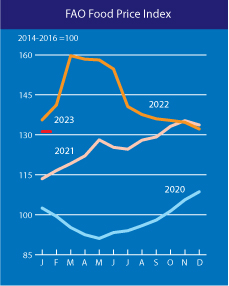 » The FAO Sugar Price Index averaged 115.8 points in January, down 1.3 points (1.1 percent) from December, marking the first decline after sharp increases registered in the previous two months. The January decline in international sugar price quotations was mainly triggered by the good harvest progress in Thailand and favourable weather conditions benefiting sugarcane crop development in key growing areas of Brazil. Concerns over lower crop yields in India, which could affect export availabilities, contained more substantial sugar price declines. Also, the hike in gasoline prices in Brazil, which supported demand for ethanol, and the strengthening of the Brazilian real against the United States dollar contributed to limiting the downward pressure on world sugar prices.