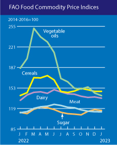 » The FAO Vegetable Oil Price Index averaged 140.4 points in January, down 4.2 points (2.9 percent) month-on-month and standing nearly 25 percent below its level a year ago. The decrease reflected lower world prices of palm, soy, sunflowerseed and rapeseed oils. In January, international palm oil prices dropped for the second consecutive month, largely weighed by subdued global import demand, as major importers replenished their stocks during the past few months. World soyoil quotations also fell moderately, linked to sluggish import demand due to uncompetitive prices compared with those of other vegetable oils, as well as improved weather conditions in Argentina lately, raising production prospects. In the case of sunflower and rapeseed oils, international prices fell on ample global export supplies.