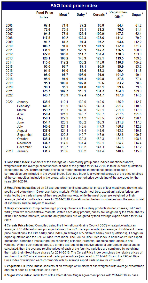* Unlike for other commodity groups, most prices utilized in the calculation of the FAO Meat Price Index are not available when the FAO Food Price Index is computed and published; therefore, the value of the Meat Price Index for the most recent months is derived from a mixture of projected and observed prices. This can, at times, require significant revisions in the final value of the FAO Meat Price Index which could in turn influence the value of the FAO Food Price Index.